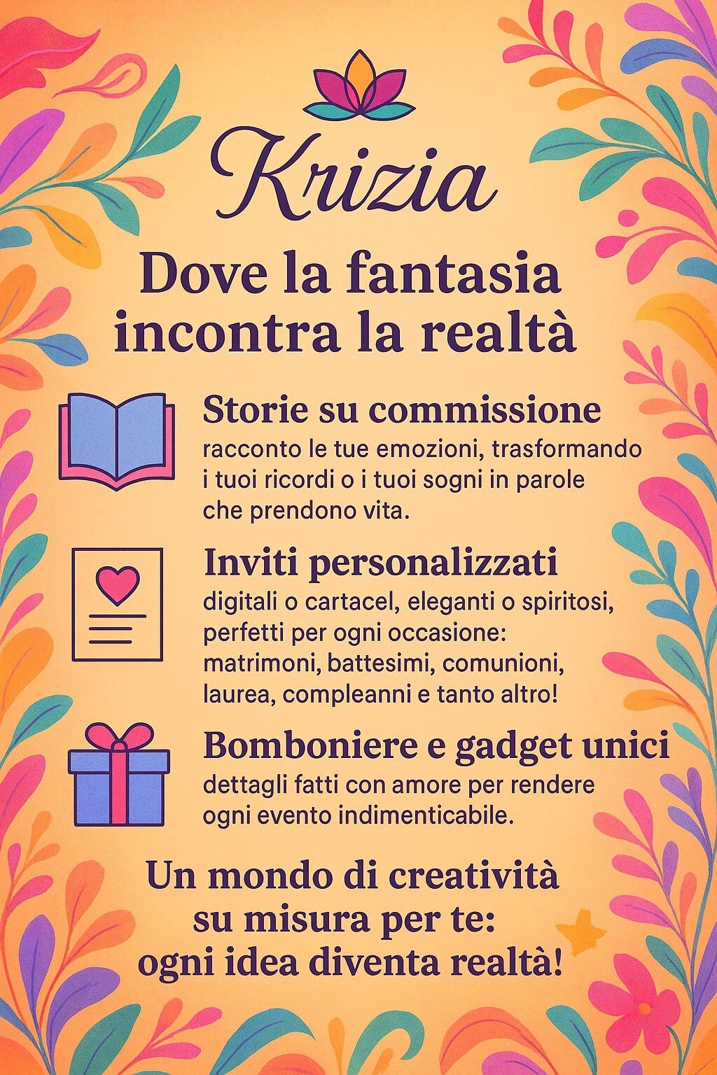 Sono Krizia e trasformo i tuoi ricordi e le tue idee in storie indimenticabili. Scopri come posso creare un libro unico per te o per i tuoi bambini, rendendoli protagonisti di avventure fantastiche. Sono qui per dare vita alle tue storie!